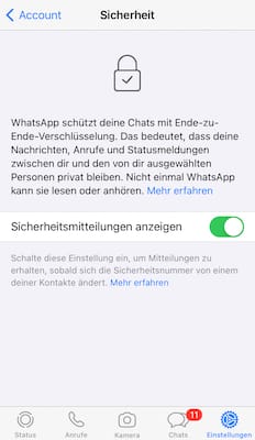 WhatsApp bietet seit 2016 eine Ende-zu-Ende-Verschlüsselung für seine Nutzer an. Ende-zu-Ende-Verschlüsselung, dass die Nachrichten beim Sender verschlüsselt werden und erst wieder beim Empfänger erfolgreich entschlüsselt werden.